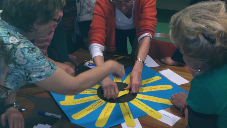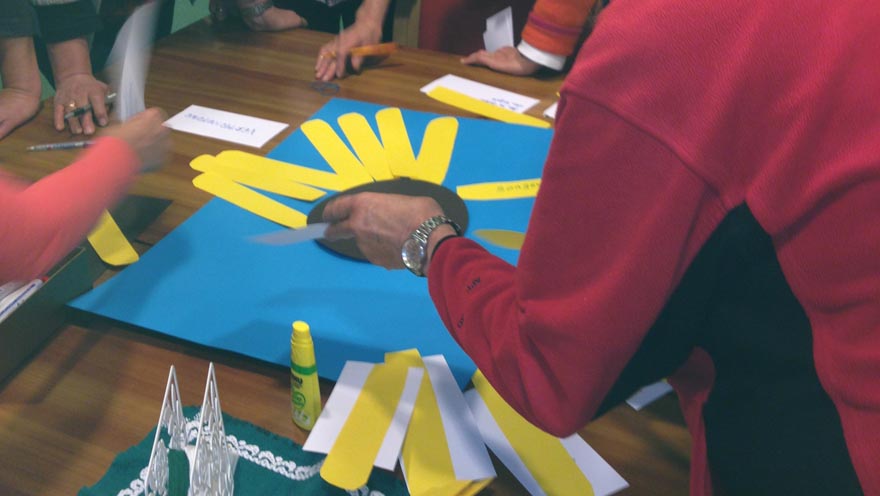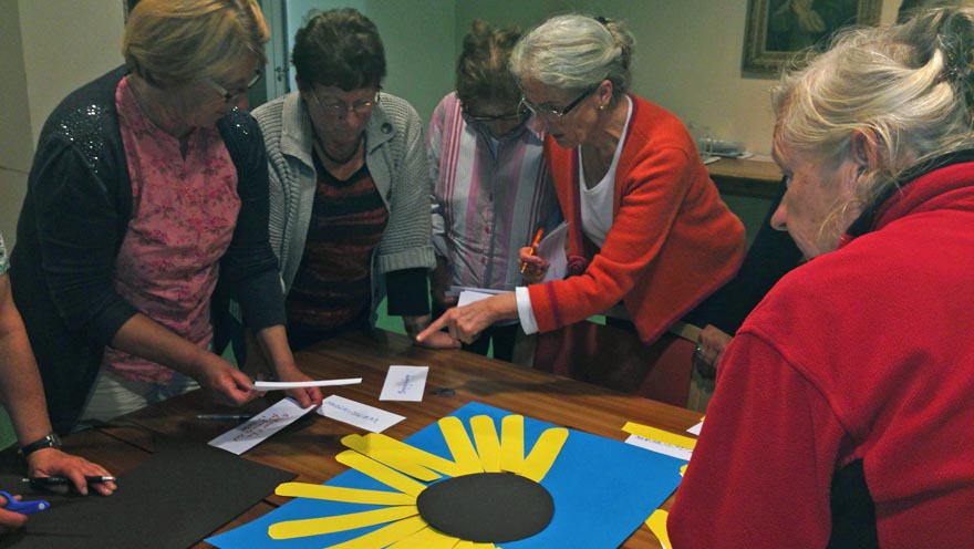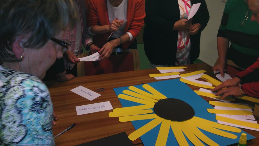 Es gab eine anregende Diskussion und viele interessante Beiträge von persönlich Erlebtem. Als Abschluss gestaltete die Hospizgruppe eine Sonneblume mit folgenden Begriffen, die für alle Anwesenden die Ehrenamtliche Hospizbegleitung ausmachen: