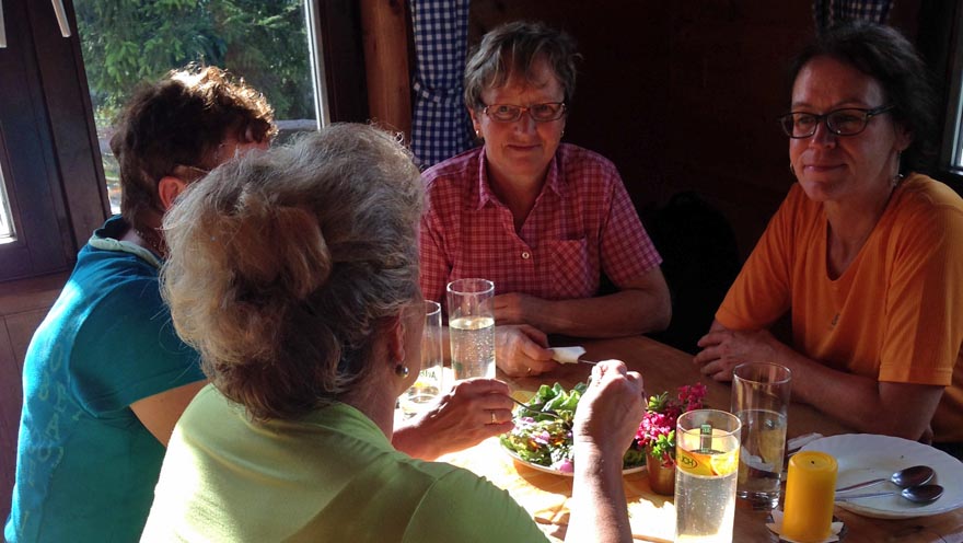 Die Sennerin Gisela hat für uns einen Wildkräuter-Salat, eine Wildkräuter-Suppe und Kasspatzeln vorbereitet. Anschließend gab es noch Kaffee und selbstgebackenen Kuchen. Die Musikanten Maria und Michael unterhielten uns mit Volksmusik. Es war für uns alle ein sehr netter und unterhaltsamer Nachmittag.