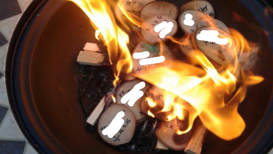 Bisher wurden die Namen der Verstorbenen auf einen Stein geschrieben, die im Rahmen des Rituals dem Inn übergeben wurden. Seit diesem Jahr werden die Namen auf Holzscheiben geschrieben, die dann in einer Schale verbrannt werden.